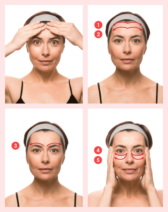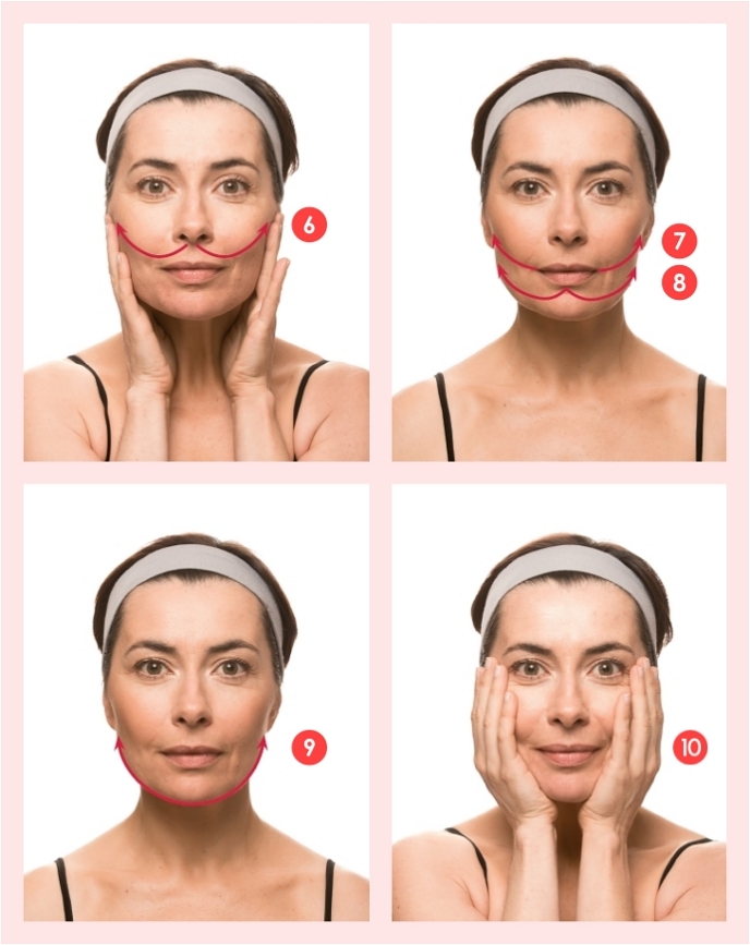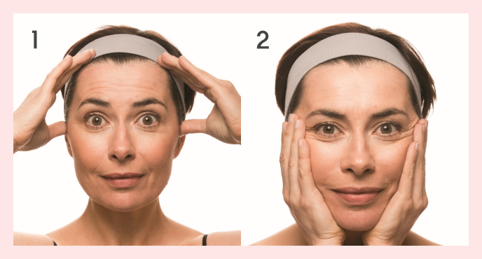 마사지에 앞서 엄지손가락과 집게손가락을 이용해 얼굴 중앙부에서 바깥쪽으로 피부 표면을 살짝 꼬집듯 부드럽게 눌러주면 혈액순환을 촉진해 마사지 효과를 높인다. 셀프 마사지는 손가락 끝을 사용하고, 모든 동작을 3회 반복한다.