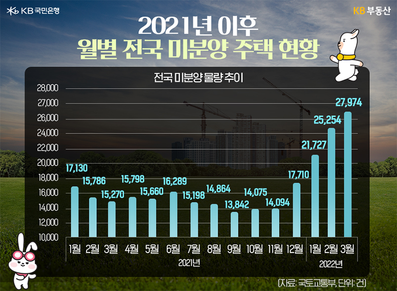 해당 자료는 국토교통부에서 확인할 수 있는데요. 통계를 보면, 2022년 3월 말 전국 미분양 물량은 2만7,974가구로 2월 말 2만5,254가구 대비 10.8% 증가했습니다. 이는 지난해 1월 이후 최고치인데요. 지난해 9월 1만3,842가구에서 6개월 연속 늘고 있는 추세입니다. 이중에서는 지역별로 대구(6,572가구), 경북(6,519가구)에 미분양이 많고, 수도권도 3월 현재 2,921가구로 전월 대비 26% 증가했습니다.