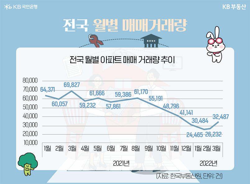 그러나 최근 전국 아파트 매매 거래량은 2021년 8월 이후 꾸준한 감소세를 보이다가 2월부터 소폭 반등했습니다. 지난해 8월은 한달 동안 6만1,170건이 거래됐었는데요. 2022년 들어서는 1월 2만4,465건까지 줄어 그동안의 급격한 집값 상승에 대한 피로감, 대출 규제와 금리 인상에 대한 부담감을 나타냈습니다. 이후 2월 2만6,232건, 3월 3만2,487건으로 다시 증가하는 추세입니다.